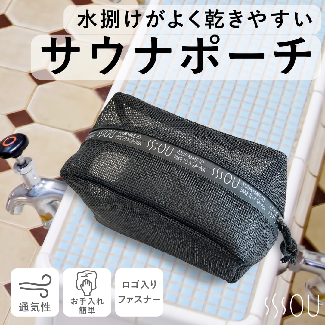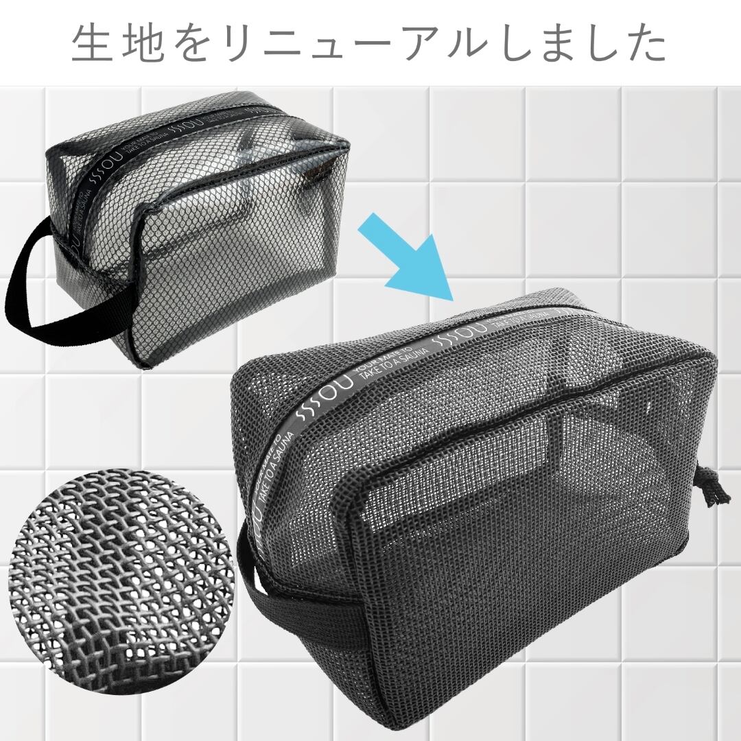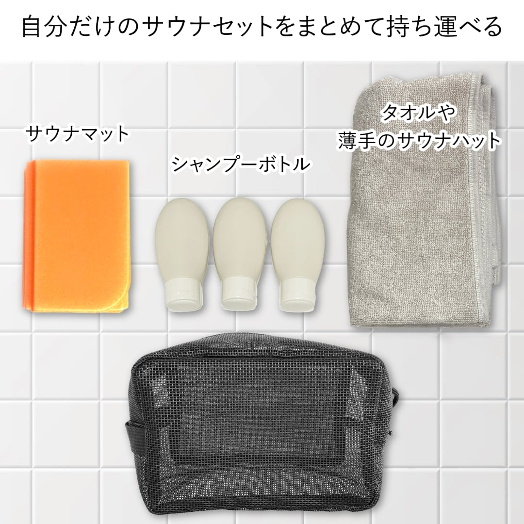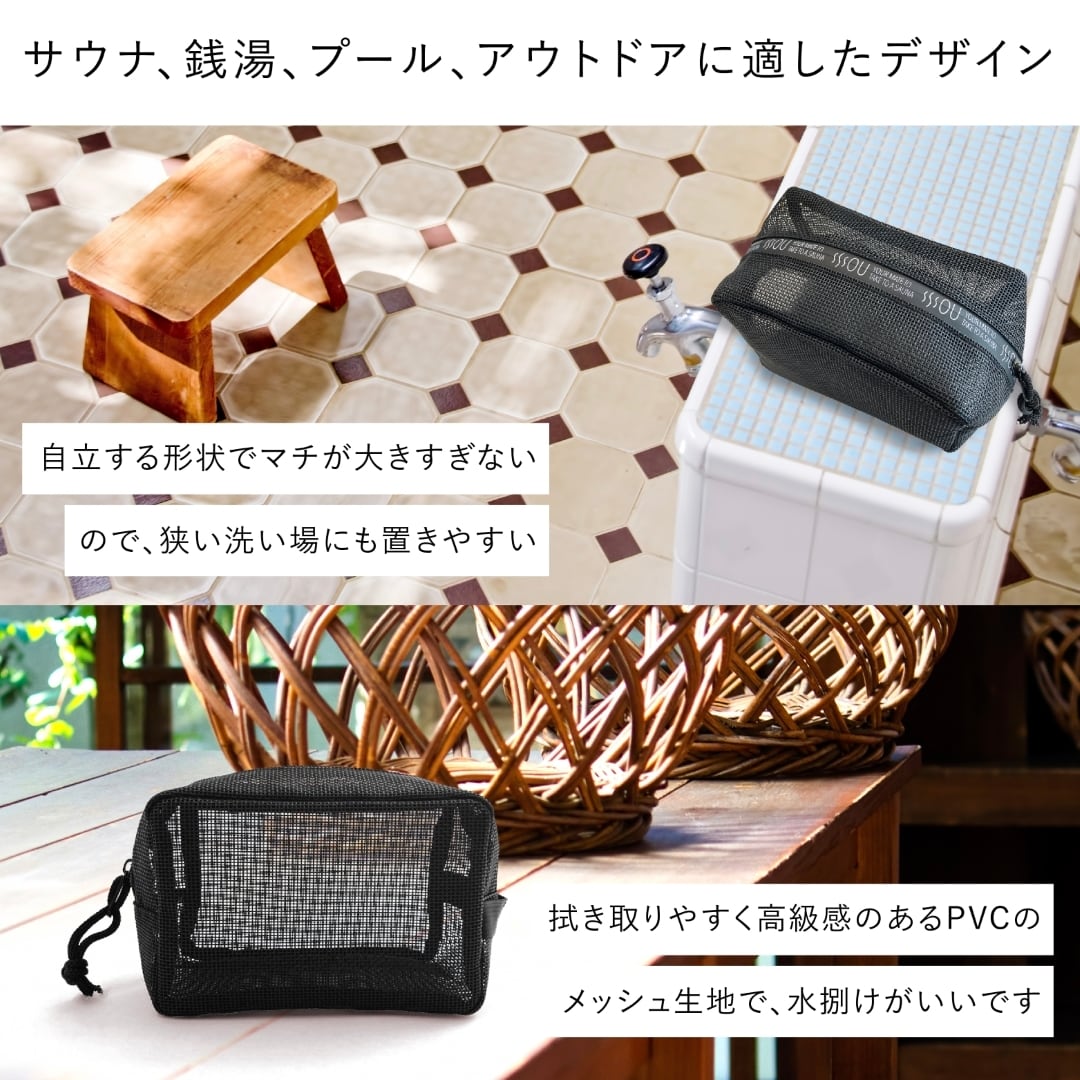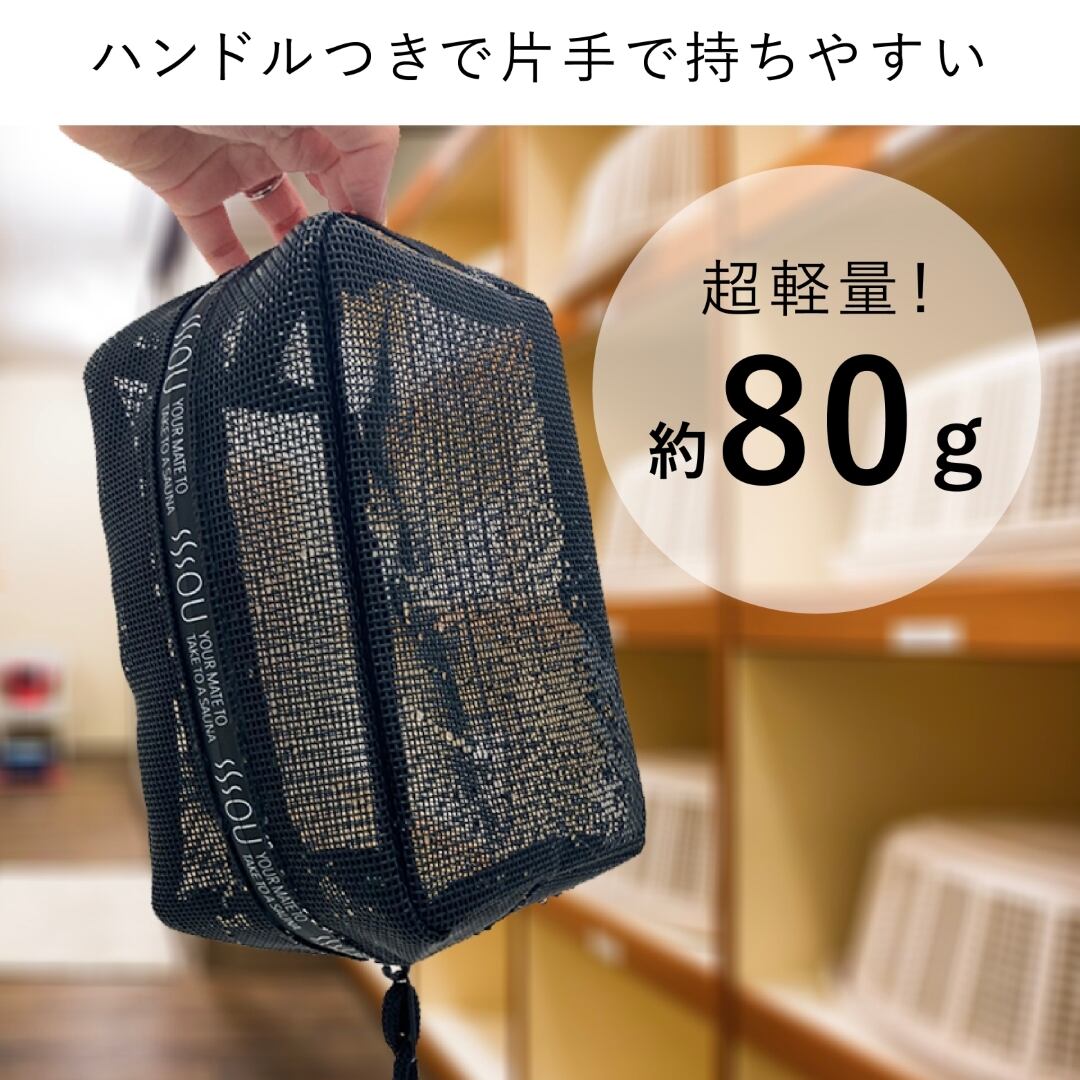 SOU by RAKUSE スパバッグ サウナバッグ コンパクト ブラック マイサウナバッグ 温泉バッグ メッシュ素材 銭湯 温泉バッグ 水泳 ジム 温泉用 お風呂 浴室持込サイズ ファスナー付 スパポーチ ジム シャワー レディース メンズ 撥水性PVC