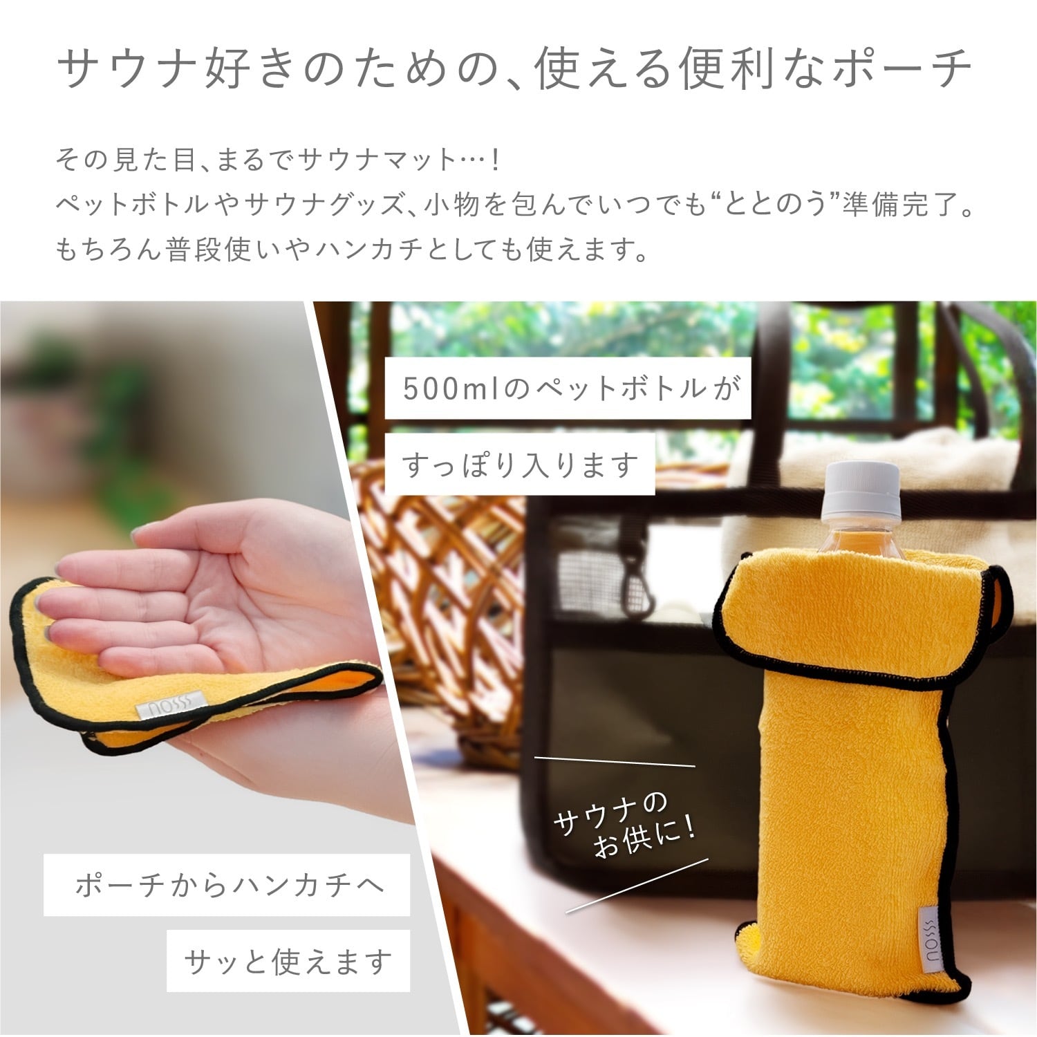 2WAY設計: ハンカチとしての使用、またはペットボトルカバーとしても使える便利な多機能ポーチです
