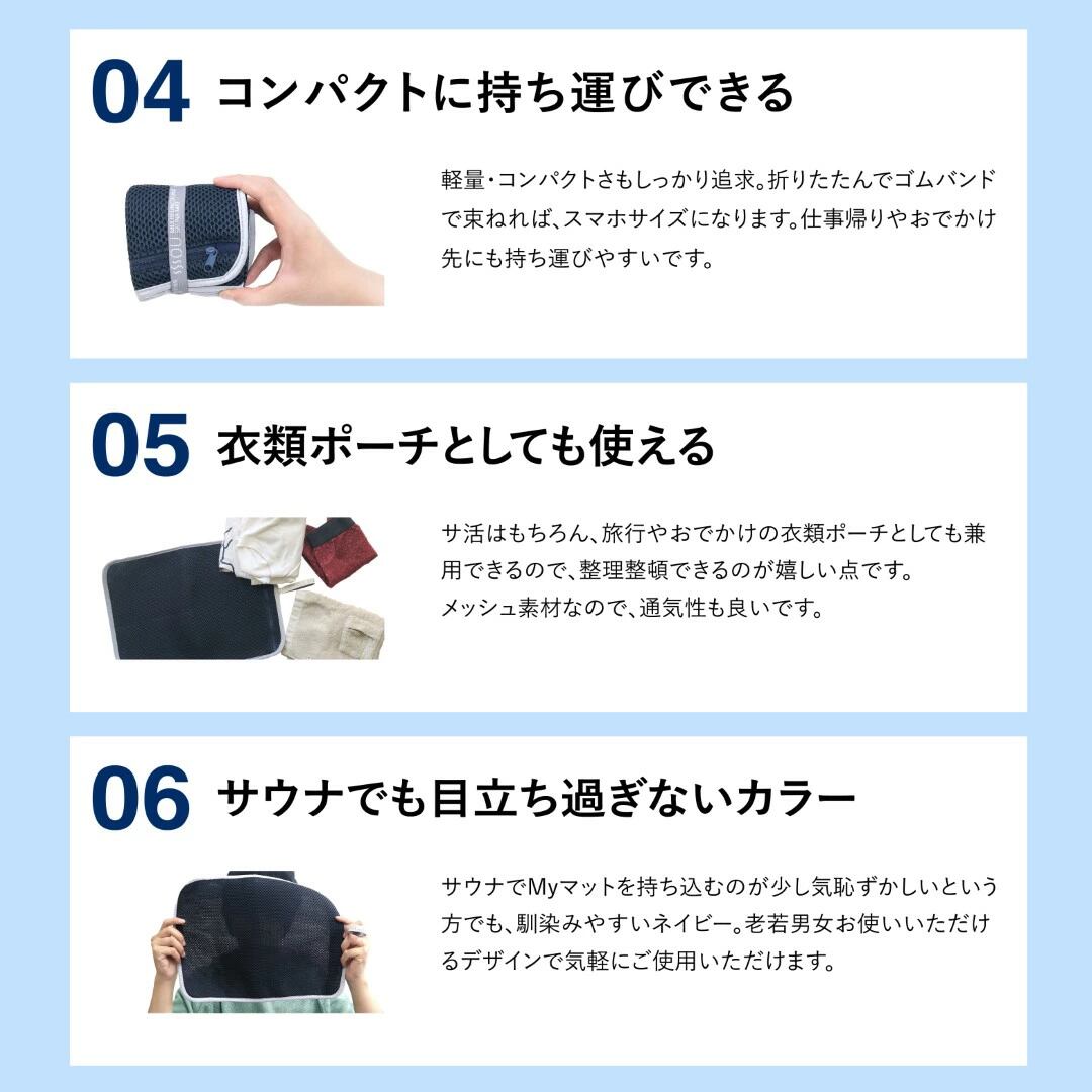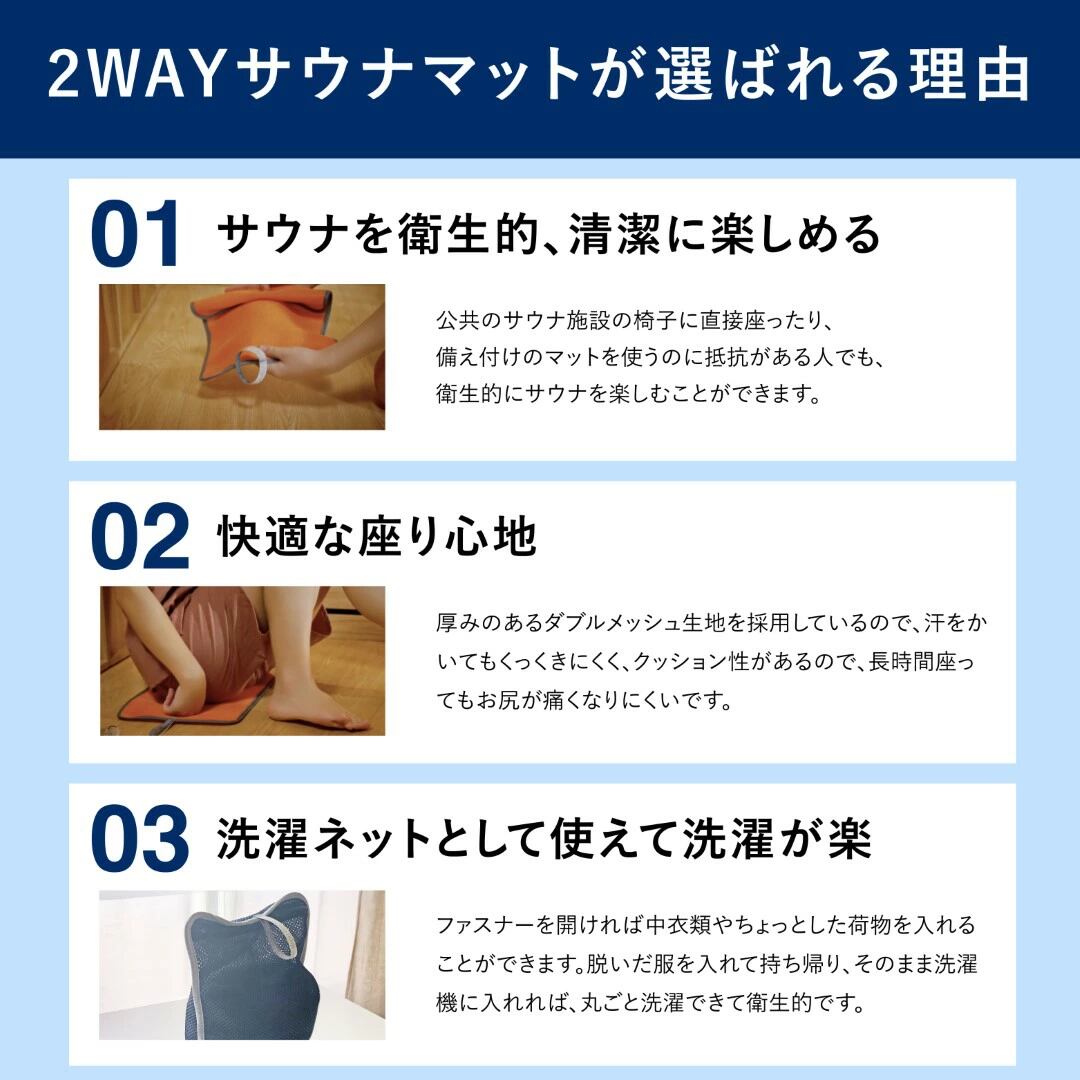 【2WAYサウナマット】マットに洗濯ポーチ機能を搭載した2WAYサウナマット。くるっと巻いても、折り畳んでも、フックに掛けても!収納できるゴムバンド折りたたむと約15cmほどのコンパクトサイズに。かさばらず、持ち運びや収納に便利。丸洗い可能服を洗濯するついでに、マットも洗濯できて機能的です。