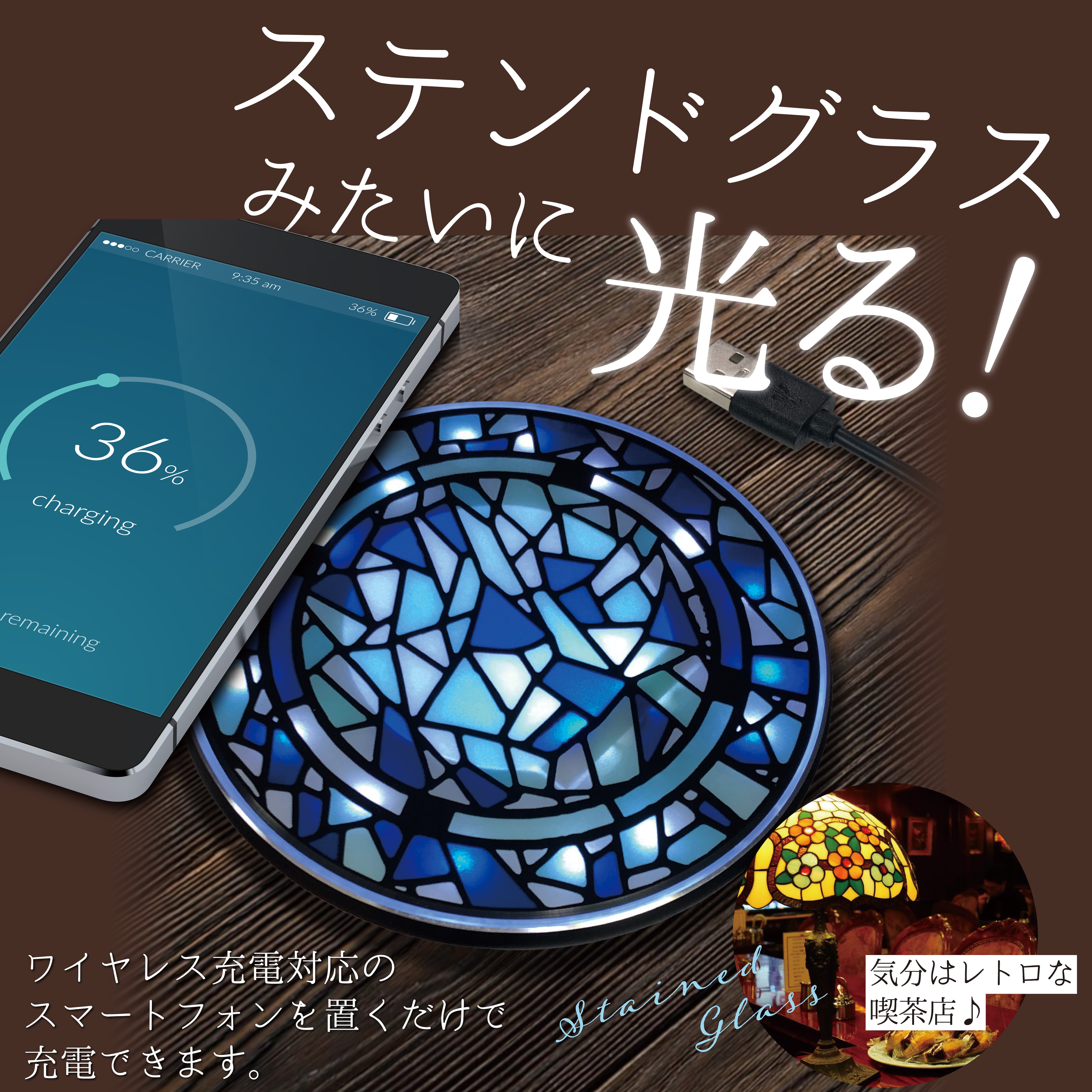 ・レトロなステンドグラス風デザインがおしゃれなワイヤレス充電器です。