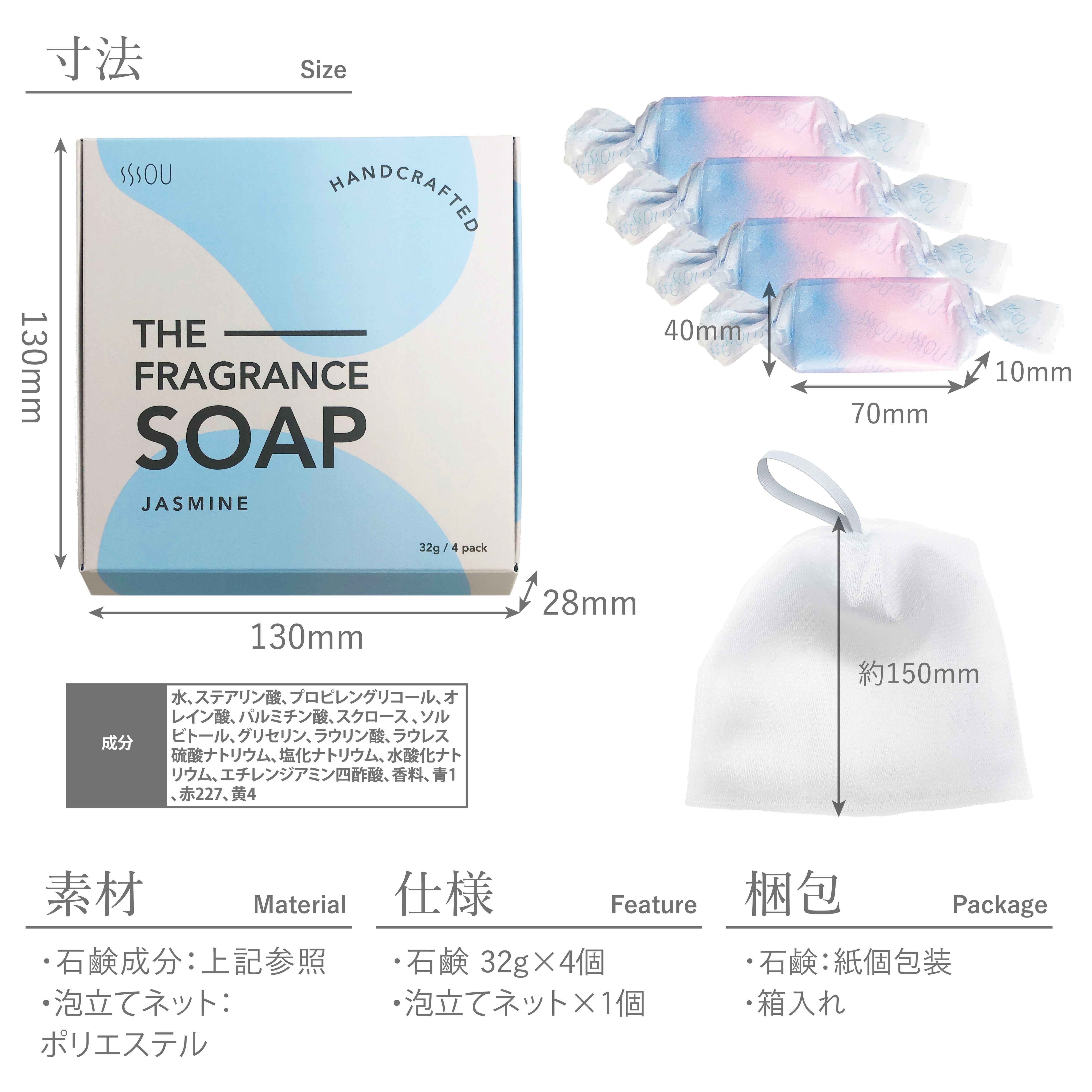 SOU by RAKUSE 小さなアロマ石鹸 4個セット 泡立てネット【ギフト/プレゼント/誕生日/送別/女性/アロマ/フレグランス/手づくり/個包装】 ジャスミン 全身用 128g