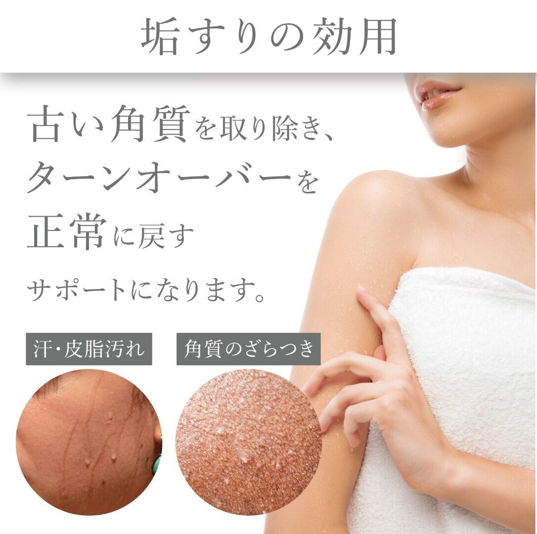 肌に優しい素材: 厳選されたビスコース(人工シルク)100%を使用。ナイロンよりも痛みが少なく、シルクよりも垢をしっかり落とせる素材です。特に、超極細繊維を使用しており、刺激を抑えつつ、やさしく垢すりができます。