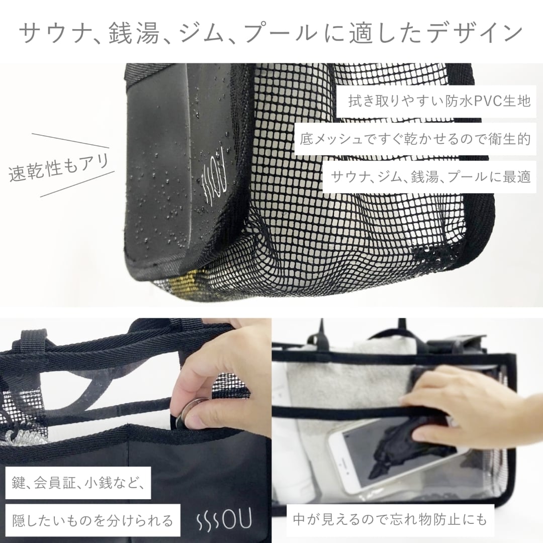 スパやサウナ、温泉にも最適です。メッシュの窓付きで中身が一目でわかり、化粧品やアクセサリーなどの小物を整理整頓できます。ブラック色なので、汚れも目立ちにくく、手入れも簡単です。軽量で持ち運びも楽々、旅行やジムの行き帰りにも便利なアイテムです。ジムやスパ、旅行に最適なコンパクトなバッグをお探しの方におすすめです。