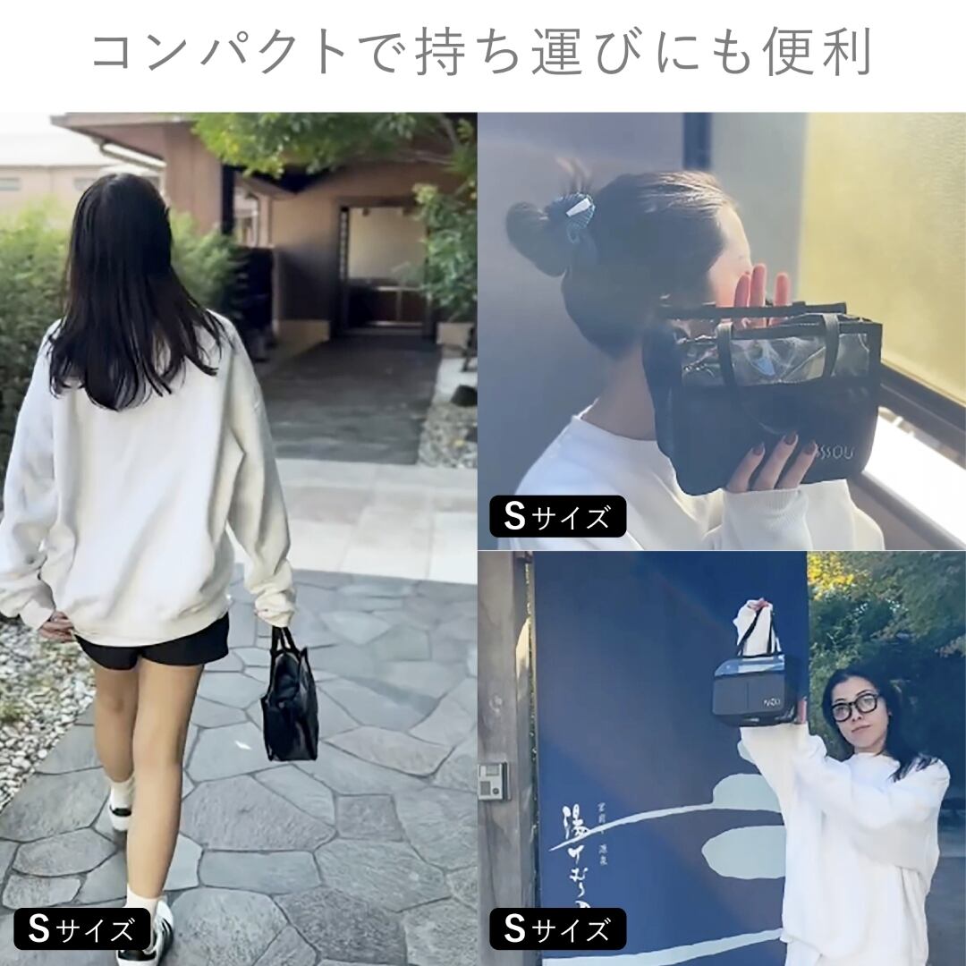 スパやサウナ、温泉にも最適です。メッシュの窓付きで中身が一目でわかり、化粧品やアクセサリーなどの小物を整理整頓できます。ブラック色なので、汚れも目立ちにくく、手入れも簡単です。軽量で持ち運びも楽々、旅行やジムの行き帰りにも便利なアイテムです。ジムやスパ、旅行に最適なコンパクトなバッグをお探しの方におすすめです。
